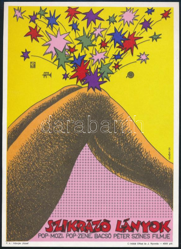 Description: Kemény György (1936-): Szikrázó lányok, Bacsó Péter színes filmje, filmplakát, villamosplakát, jelzett a plakáton, Offset és J. Nyomda, 23,5x17 cm. Magyar pop art plakát!