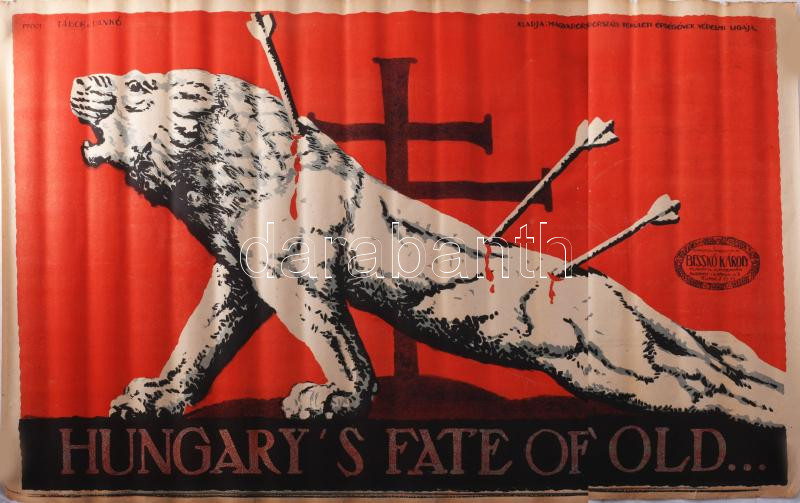 Description: Tábor (Taupert) János (1890-1956), Dankó Ödön (1889-1958): "Hungary's fate of old", 1920. Chromoilitográfia, papír. Jelzett a plakáton. Besskó Károly plakát és címkegyár. Kiadja Magyarország Területi Épségének Védelmi Ligája. Angol ny. irredenta plakát. 63x96 cm. Apró sérülésekkel a szélén, feltekerve.