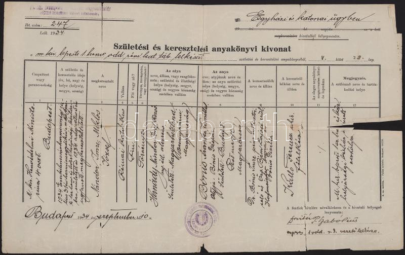 1934 Hernády Nándor (1879-1939) alezredes születési anyakönyvi kivonata. Sérüléssel