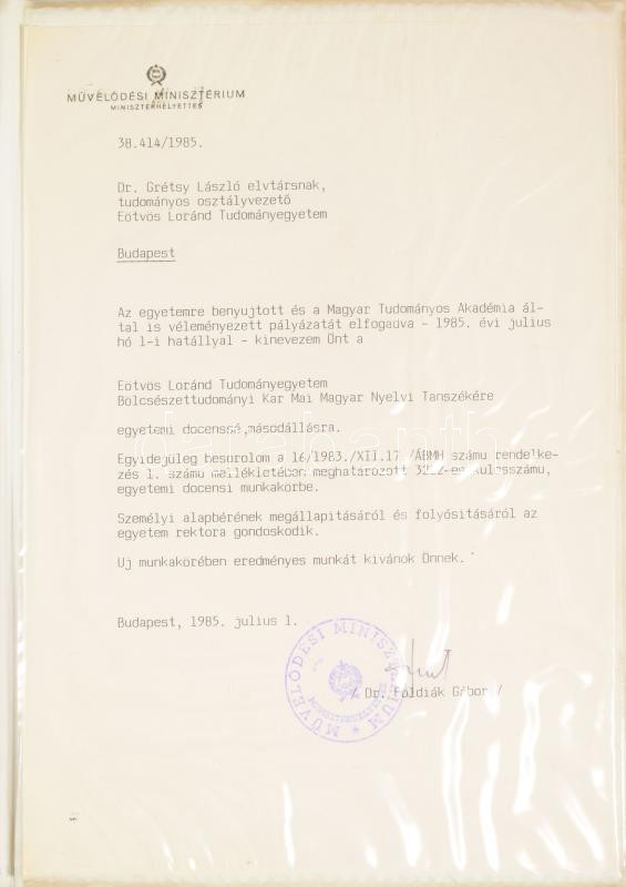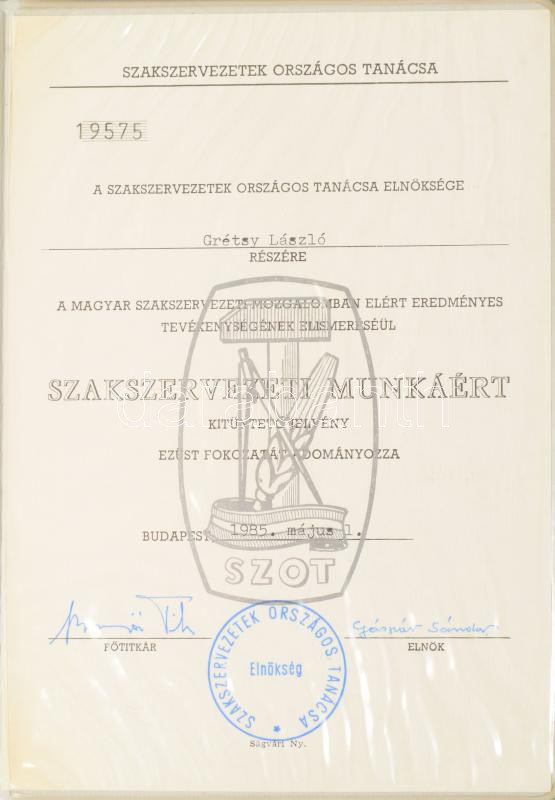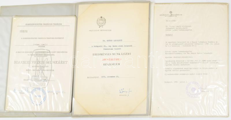 1975-1985 Grétsy László (1932-2024) nyelvész részére adományozott 3 darab kitüntetés, dicséret, kinevezés. Szakszervezetek Országos Tanácsa, Oktatási Minisztérium, Művelődési Minisztérium.