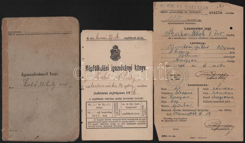 1895-1944 Szabó Mihály őrvezető vegyes iratai: népfölkelési igazolványi könyv, katonai igazolványi lap, leszerelési jegy, stb., összesen 6 db