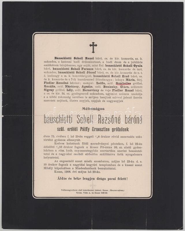 1908 Kassa, bauschlotti báró Schell Rezsőné, szül. erdődi Pálffy Ernesztine (1833-1908) halotti értesítője, kisebb lapszéli sérülésekkel, 29x23 cm