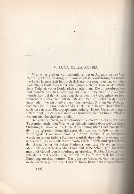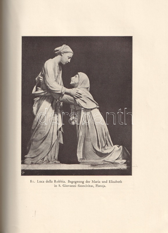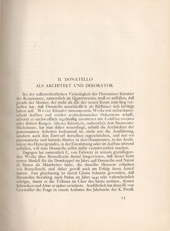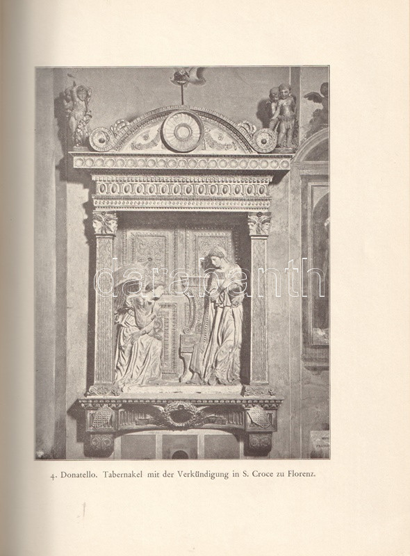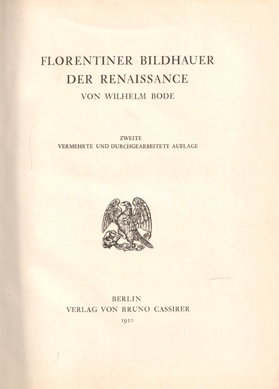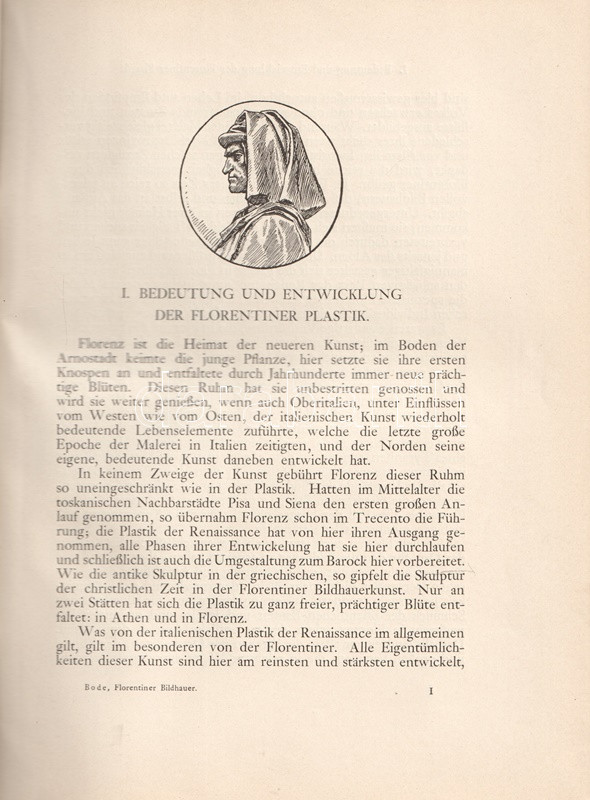 Wilhelm von Bode (1845-1929) porosz művészettörténész, múzeumalapító, a berlini műgyűjtemények főigazgatója. Szobrászati monográfiájában a firenzei reneszánsz szobrászat motívumkincsét vizsgálja, oldalszámozáson belül gazdag illusztrációs anyaggal. A munka első kiadása 1902-ben jelent meg, példányunk a második, bővített kiadásból való.