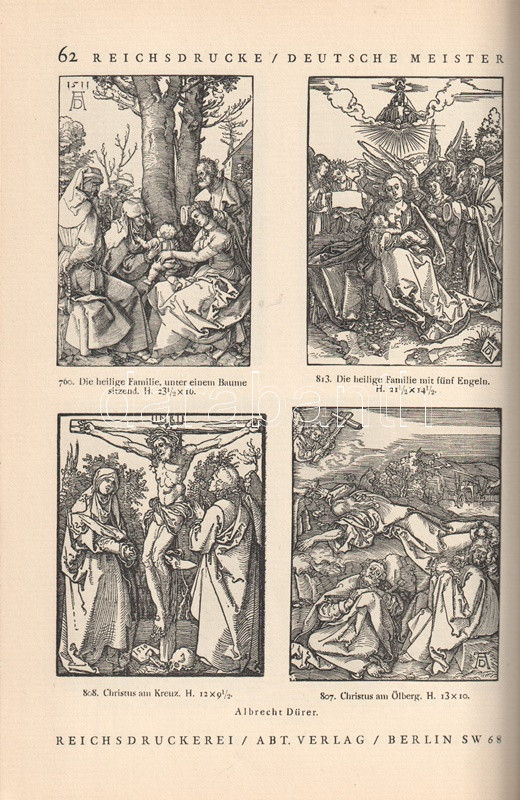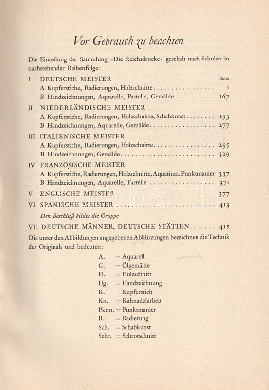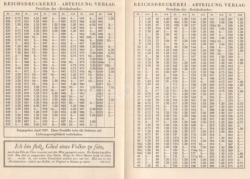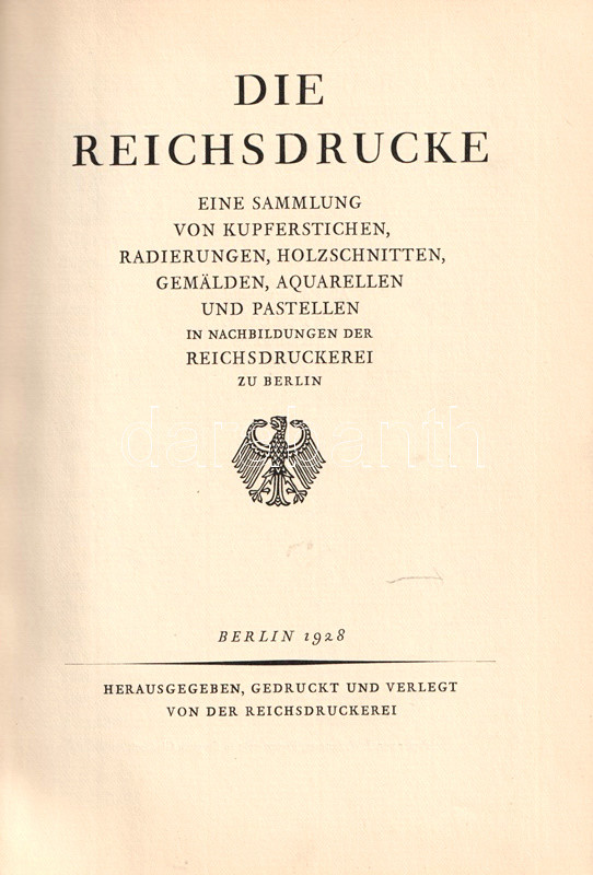 A berlini császári nyomda, a Reichsdrucke a századfordulótól több grafikai albumot kibocsátott, mely reprodukcióival emléket állított a grafikaművészet elmúlt négy évszázados fejlődésének. Gazdagon illusztrált grafikatörténeti albumunk nem csak a fametszés, a rézmetszés és acélmetszés, a miniatúra-művészet és az akvarell-festészet nagyszerű alkotásait mutatja be német, németalföldi, itáliai, francia és angol mesterektől, hanem lehetőséget ad a vásárlónak, hogy lakása, irodája, szalonja díszítésére nyomatokat rendeljen meg. Az 1023 grafikát felvonultató katalógus lehetőséget ad tehát arra, hogy középkori kártyalapok, késő gótikus Dürer-látomások, dévaj Rembrandt-grafikák vagy éppenséggel kortárs politikusportrék: Ebert- vagy Hindenburg-portrék nyomatait vásárolja meg a katalógusolvasó lakása ékesítésére. Katalógusunk kétleveles mellékletén a nyomatok árlistája.