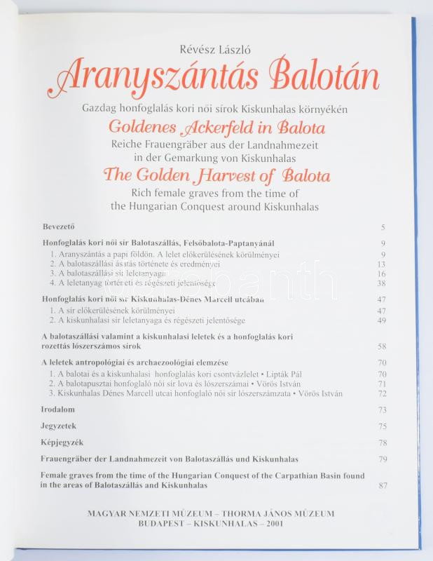 Révész László: Aranyszántás Balotán. Bp., 2001, Magyar Nemzeti Múzeum. Kiadói kartonált papírkötés.