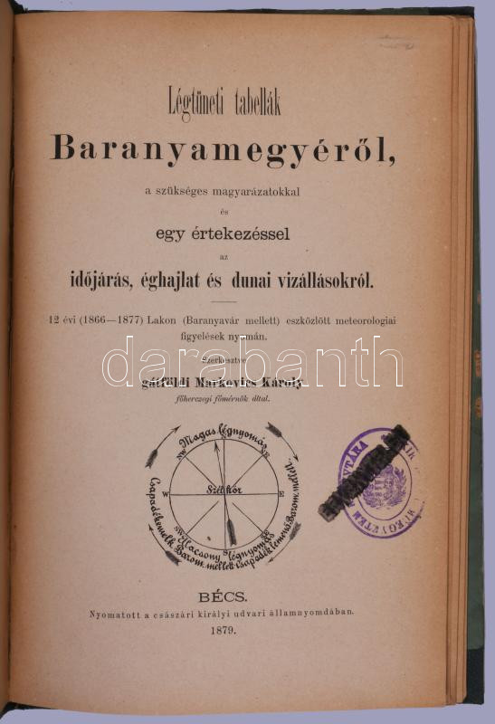 Markovics Károly: Légtüneti tabellák Baranyamegyéről, a szükséges magyarázatokkal és egy értekezéssel az időjárás, éghajlat és dunai vízállásokról. Bécs, 1879, Cs. k. udvari államnyomda. Félvászon kötés, kopottas állapotban.