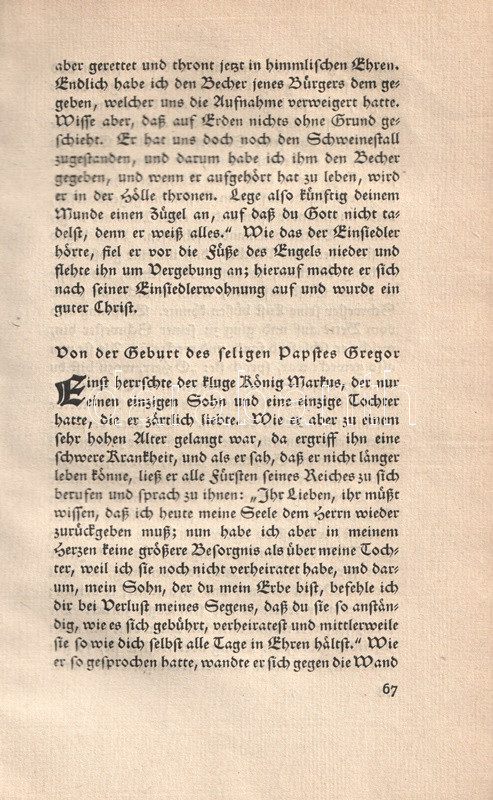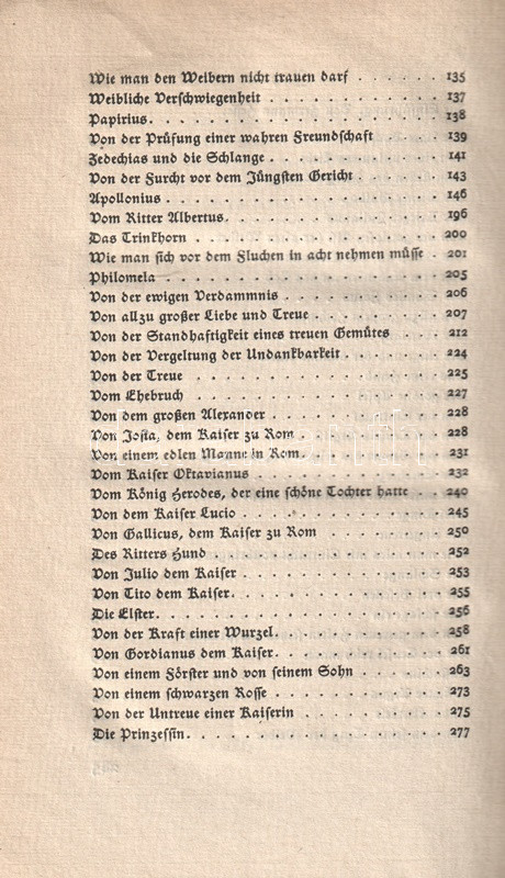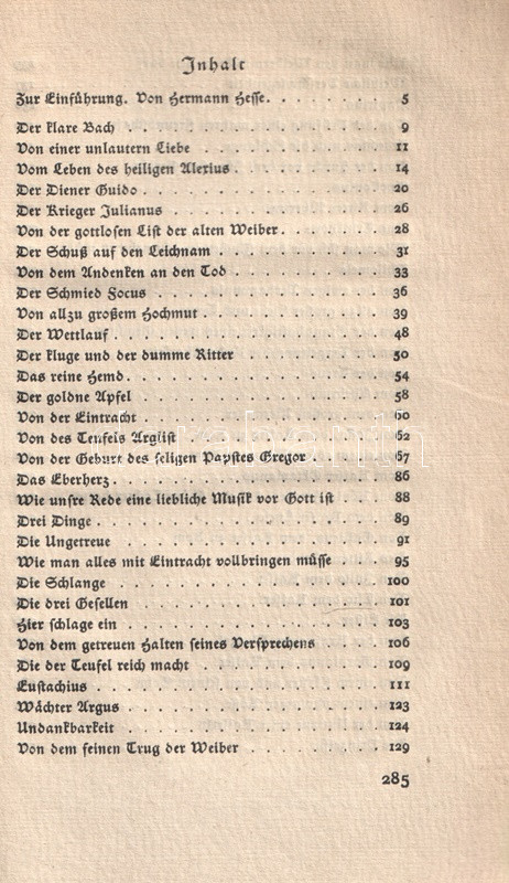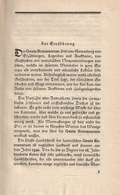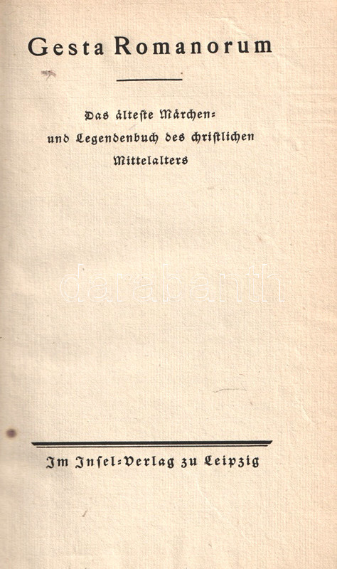 A Gesta Romanorum, azaz a középkori itáliaiak életéből vett anekdoták gyűjteménye a 13-14. századtól ismert. Az erkölcsi tanulságokban és világi hiúságokban egyaránt gazdag anekdotákat a katolikus klérus előszeretettel használta prédikációi élénkítésére; a közszájon forgó gyűjtemény első lejegyzései a 14. századtól ismeretesek. A nyomtatott korszak elején ősnyomtatványként is megjelent, latin és nemzeti nyelvű változatokban egyaránt. Első német kiadása Augsburgban jelent meg (1489), modern fordítását Johann Georg Graesse irodalomtörténész készítette el (1842). A becses középkori anekdotagyűjteményt a bibliofil Insel-Verlag Hermann Hesse előszavával adta ki újra (1914). Példányunk a munka 1920. évi új lenyomatából való.