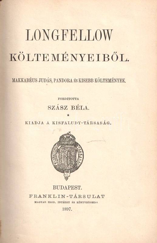 Longfellow költeményeiből. Makkabéus Judás, Pandora és kisebb költemények. Fordította Szász Béla.
