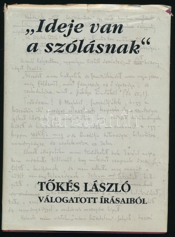 Tőkés László: ,,Ideje van a szólásnak". - - válogatott írásaiból. A szerző, Tőkés László (1952- ) református lelkész, az 1989-es romániai forradalom meghatározó alakja, 1990-től 2009-ig a Királyhágómelléki Református Egyházkerület püspöke, 2007 és 2019 között európai parlamenti képviselő által aláírt példány. Nagyvárad, 1993, Királyhágómelléki Református Egyházkerület Tájékoztatási Szolgálata, 123+[1] p. Kiadói egészvászon-kötés, sérült kiadói papír védőborítóban.