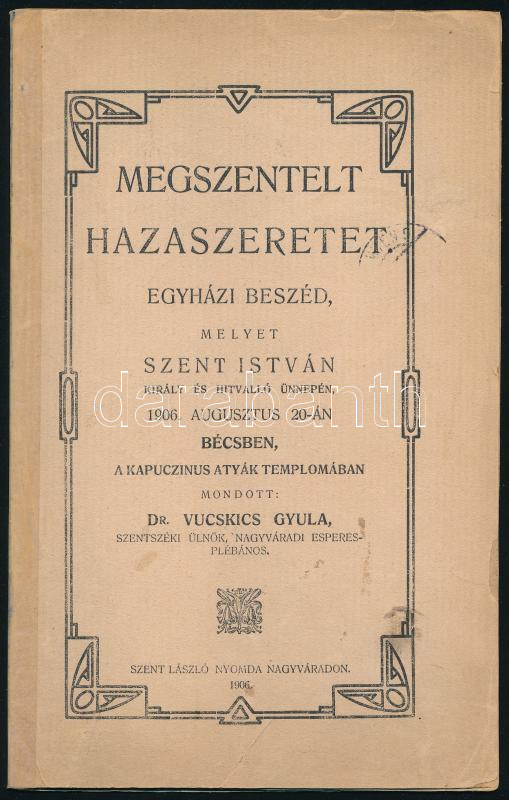 Megszentelt hazaszeretet. Egyházi beszéd, melyet Szent István király és hitvalló ünnepén, 1906. augusztus 20-án Bécsben, a kapuczinus atyák templomában mondott: Dr. Vucskics Gyula, szentszéki ülnök, nagyváradi esperes-plébános. Nagyvárad, 1906, Szent László Nyomda. Javított papírkötésben, kopottas állapotban.
