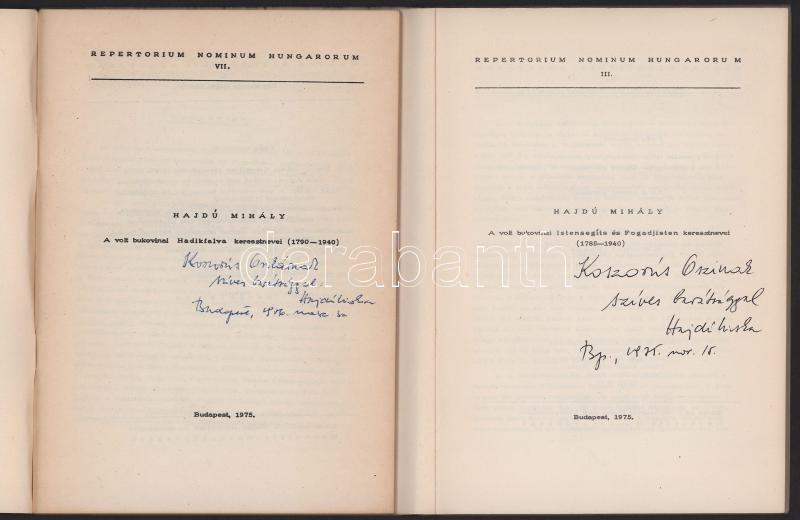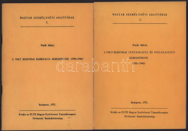 Hajdú Mihály: A volt bukovinai Hadikfalva keresztnevei (1790-1940) + A volt bukovinai Istensegíts és Fogadjisten keresztnevei (1785-1940). Magyar Személynévi Adattárak 3. 7. Bp., 1975, ELTE. Kiadói papírkötés, kissé kopottas állapotban.