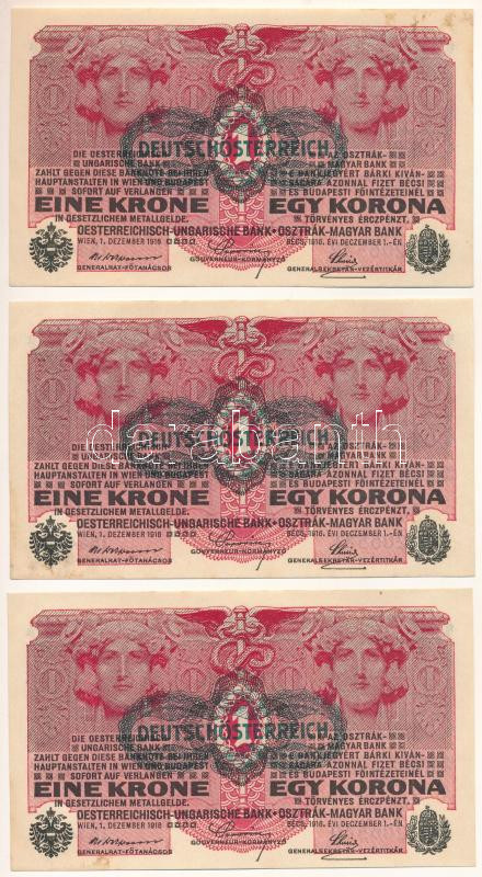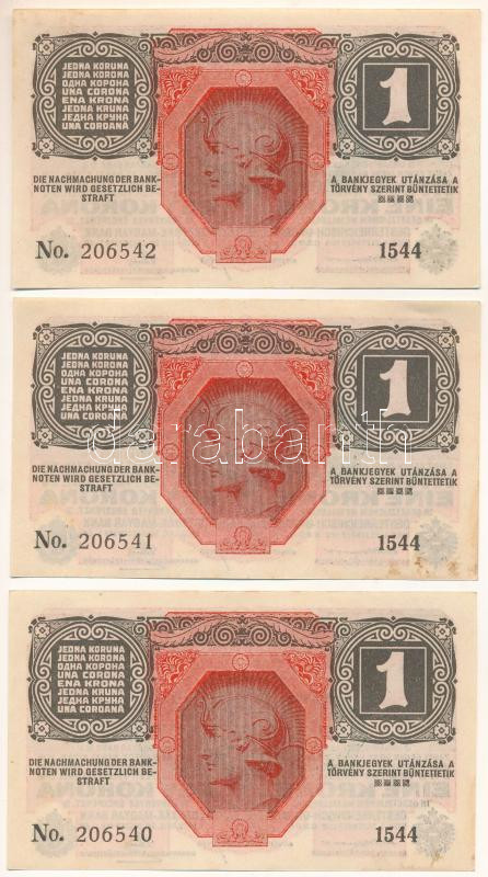 1916. 1K zöld "DEUTSCHÖSTERREICH" felülbélyegzéssel (3x) sorszámkövetők "1544 206540 - 1544 206542" T:AU fo.