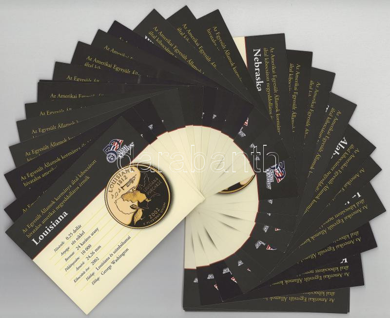Amerikai Egyesült Államok "50 állam" aranyozott negyedollárosok tanúsítványai (38db), néhány darabon hajtás, egyébként szép állapotban