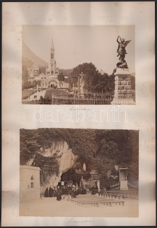 Description: cca 1900 Lourdes-i Miasszonyunk szentélyének és a Szeplőtelen Fogantatás Bazilika és a Massabielle-barlang fotói, 4 db fotó kartonon, foltos kartonnal, a kartonon bejegyzésekkel, 15x21 cm és 16x22 cm