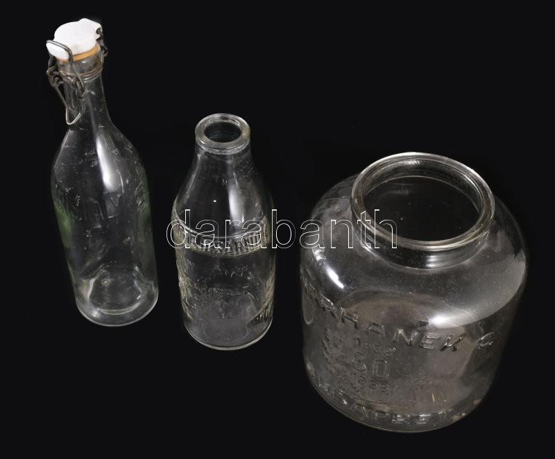 3 darab régi üveg: Warhanek C. Budapest szardíniás üveg, Kristály csatos üveg, Korona tejcsarnok üveg, m: 26 cm alatt