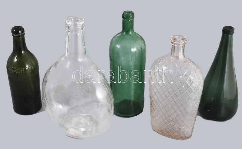 5 darab antik üveg, ritka palackkal, m. 27 cm alatt