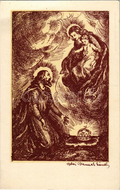 Szent István felajánlja a Szent Koronát a magyarok nagyasszonyának. Brenner Nándor kiadása / Saint Stephen, King of Hungary offers his land to the Virgin Mary