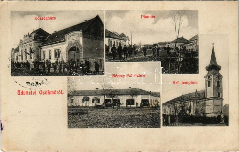 Csökmő, községháza, Piac tér, Bérczy Pál üzlete, református templom (E...