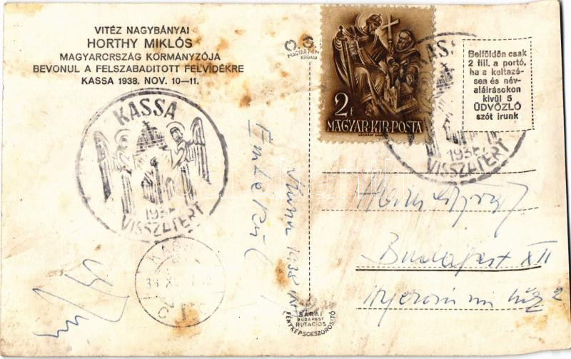 1938 Kassa, Kosice; Bevonulás, Horthy a díszkapu alatt / entry of the Hungarian troops, regent Horthy + "1938 Kassa visszatért" So. Stpl (b)