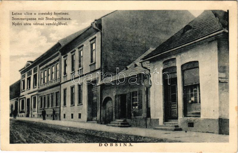 Dobsina, Dobschau; Letna ulice a mestsky hostinec / Sommergasse mit Stadtgasthaus / Nyári utca a városi vendéglővel. Lévai és Klein kiadása / street view, restaurant, inn (Rb)