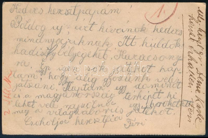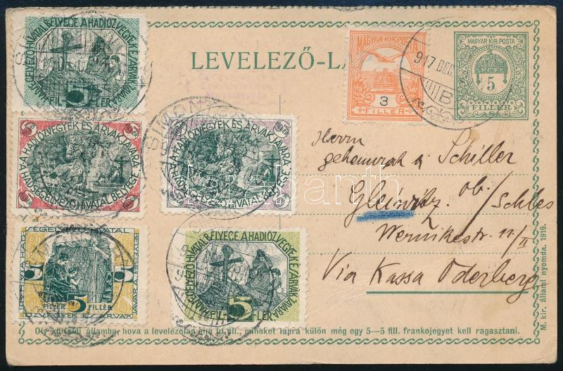 1917 Díjkiegészített díjjegyes levelezőlap rajta Hadsegélyező hivatali segélybélyegek, Kassára