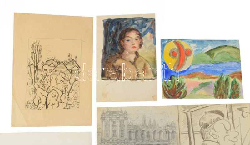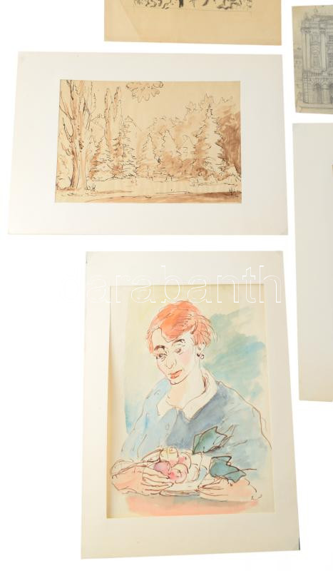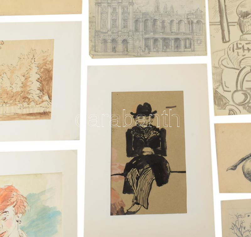 Jelzés nélkül, 1900-1930 körül: 10 db tanulmányrajz (portrék, épület, táj stb.) Klf. technikák, papír, klf, méretekben 30x21 cm-ig.