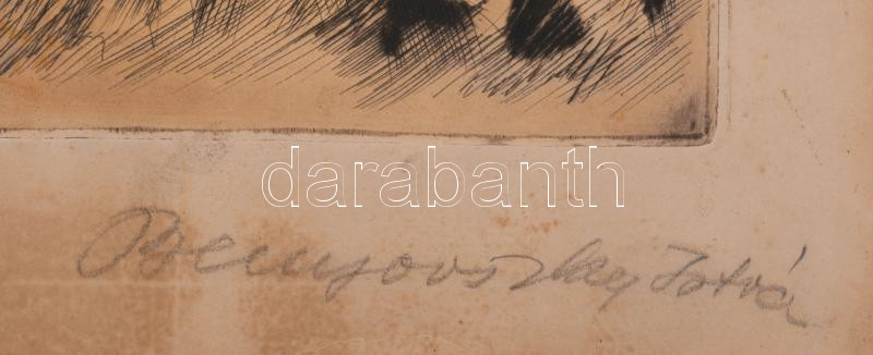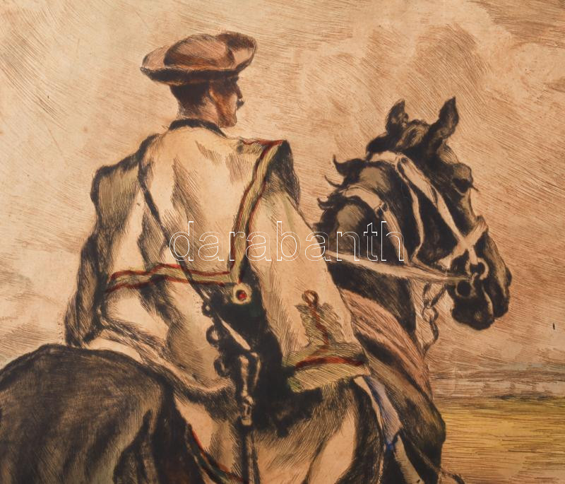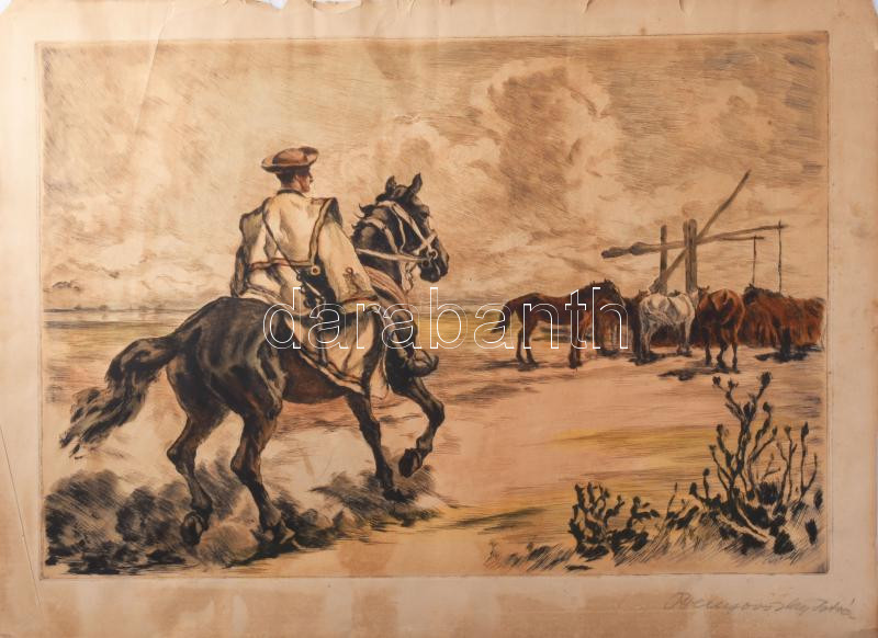 Benyovszky István (1898-1969): Itató csikós.. Színezett rézkarc, papír, jelzett, 40x54 cm