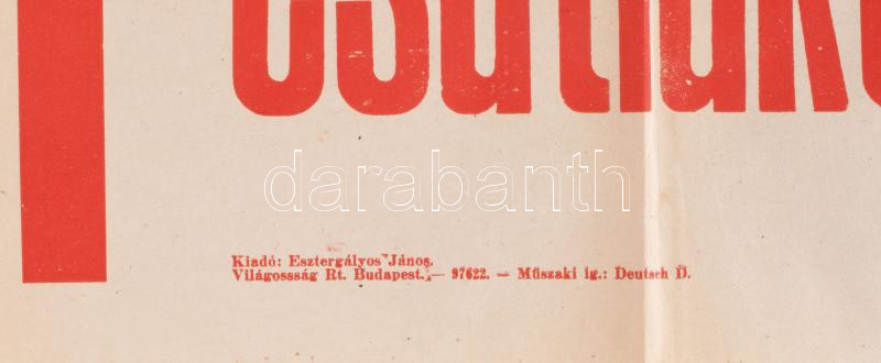 ,,Ha valóban reformokat akarsz - csatlakozzál a szociáldemokráciához" A Szociáldemokrata Párt toborzó plakátja (1933) Budapest, 1933. Világosság Rt. ny. Politikai hirdetés, mérete: 315x950 mm. A Magyarországi Szociáldemokrata Párt sorsa viharosan alakult a Tanácsköztársaság ideje alatt és után, a kommunistákkal való egyesülés ellen az MSZDP számos vezetője tiltakozott, sokuk el is hagyta az országot. Vezetőik másik részét pedig a Tanácsköztársaság bukása utáni átmeneti kormány ítélte száműzetésre. Az 1919-1920-as időszak ügyvezető kormányai ugyan jog szerint nem tiltották be az MSZDP-t, ám tagjaik és vezetőik módszeres ellehetetlenítése folytatódott. Tiltakozásképpen az MSZDP a Horthy-korszak első parlamenti választását bojkottálta. Az 1920 végi választással kormányra kerülő Bethlen István miniszterelnök a belpolitikai helyzet konszolidálására törekedett, így a rendszer erős ellenzékének számító szociáldemokraták vezetőjével 1921 decemberében egyezséget kötött (Bethlen-Peyer-paktum). Ennek jegyében a következő országgyűlési és törvényhatósági városi választásokon a MSZDP már indulhatott, választási és társadalmi programját bizonyos korlátozásokkal, de terjeszthette. Fontos kitétel volt, hogy a párttagságot közalkalmazottak, vasutasok és postások nem vehették fel, a mezőgazdasági dolgozók körében nem a párt nem agitálhatott, nem bírálhatta a hivatalos külpolitikát és nem terjeszthetett köztársasági propagandát, a sztrájkjogot pedig erősen korlátozták. Cserébe Bethlen egyfelől feloldotta a szakszervezetek és munkás egyesületek korábban zárolt bankbetéteit, és ígéretet tett a munkások társadalombiztosításának támogatására. Az MSZDP a következő választásokon (1922, 1926, 1931) - a választójogi korlátozásokat figyelembe véve - tűrhetően szerepelt, és 25, 14 és ismét 14 képviselőt küldhetett az országgyűlésbe, a budapesti törvényhatósági választásokon pedig jól szerepelt, és ez csökkentő tendenciával, de a német megszállásig (1944) így is maradt. 1933-ból származó plakátunk arról tanúskodik, hogy a szociáldemokrata párttagság felvételét illető kormányzati szigor ebben az időben kissé enyhült, plakátunk alsó sarkában az agitációs plakát engedélyeztetési szövege: ,,125/1933. sz. Ezen hirdetménynek terjesztését engedélyezem. A polgármester helyett Szepesváry tanácsnok. Budapest, 1933. március 7." Plakátunkon fent apró sérülések. Jó állapotú plakát, hajtogatva.