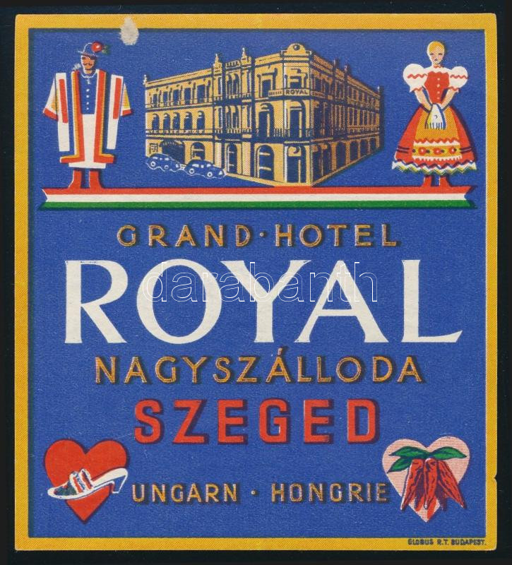 cca 1940 Hotel Royal nagyszálloda Szeged háború előtti magyar hotelcímke, bőrőndcímke, jó állapotban 10x11 cm