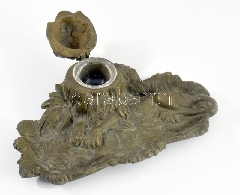 Öntött bronz oroszlán figurás tintatartó, sérült betéttel, h: 20 cm