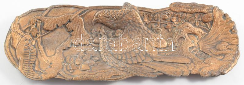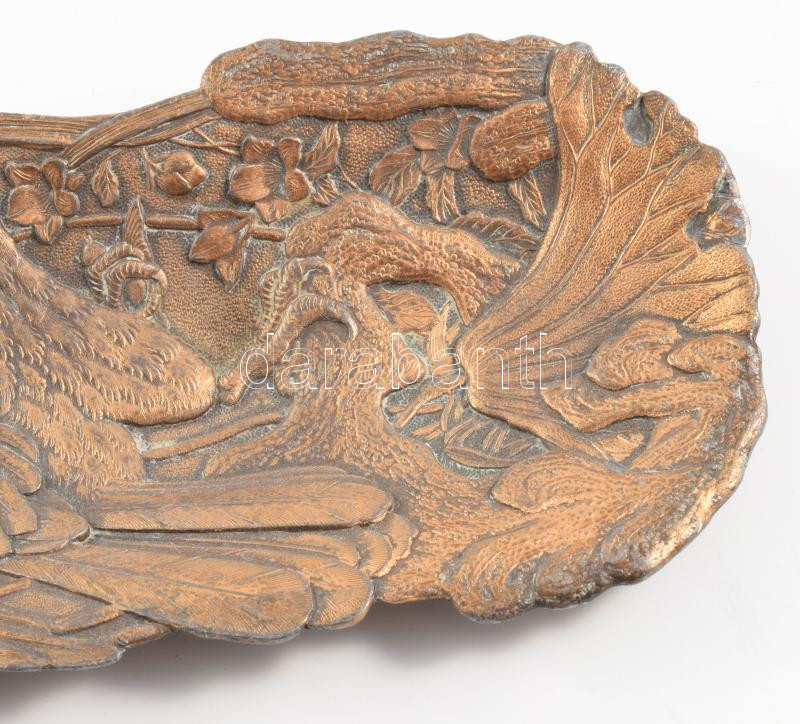 Szecessziós, hosszúkás formájú dísztál, sólyom és florális motívumos díszítéssel, bronzírozott fém, cca. XX. század eleje, 26x9,5 cm
