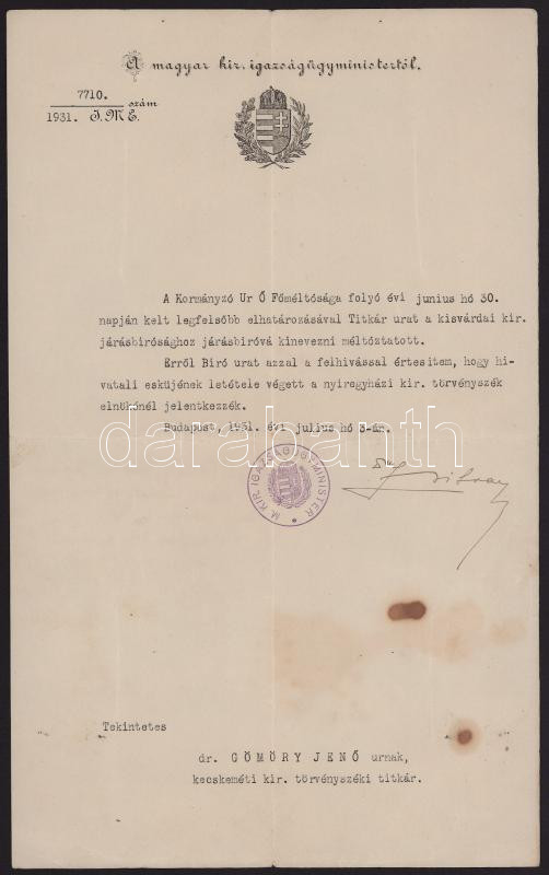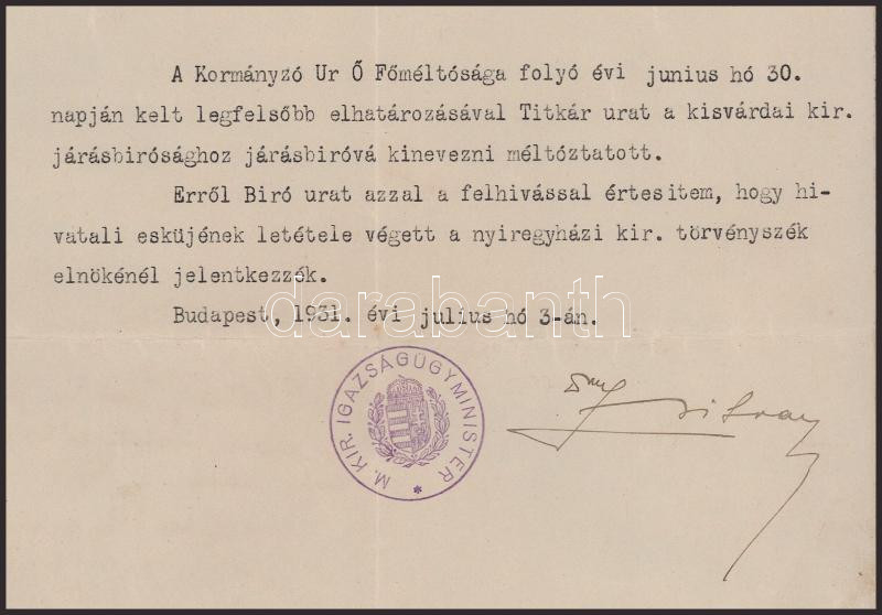 1931 Bp., Fejléces papír Zsitvay Tibor igazságügy-miniszter aláírásával