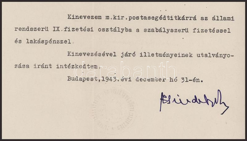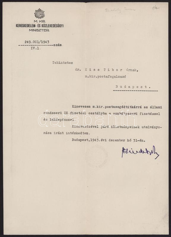 1943 Bp., Zsindely Ferenc kereskedelmi és közlekedésügyi miniszter aláírása kinevezési okmányon