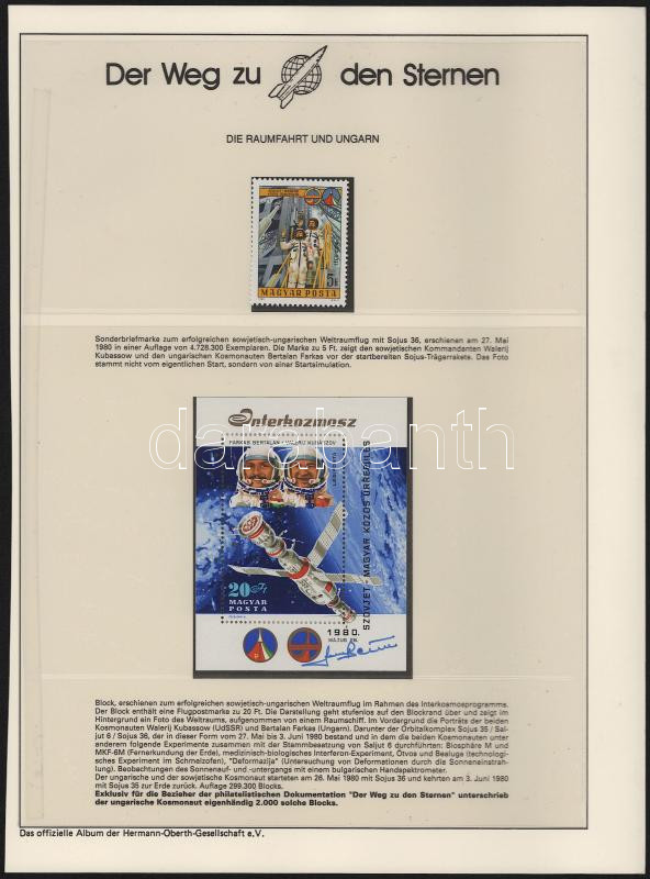 1980 Interkozmosz blokk rajta Farkas Bertalan űrhajós aláírásával / Hungarian astronauit autograph signature on imperforated MS