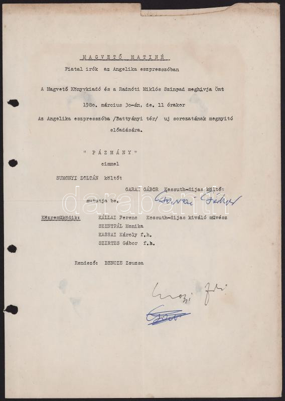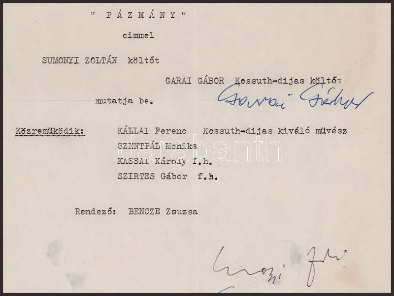 Sumonyi Zoltán (1942-) József Attila-díjas író, költő, illetve Garai Gábor (1929-1987) Kossuth-díjas költő, író, műfordító aláírása meghívón