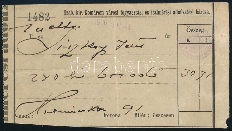 1906 Sz. kir. Komárom (Felvidék) városi italmérési adófizetési bárca kitöltve, pecsételve, jó állapotban