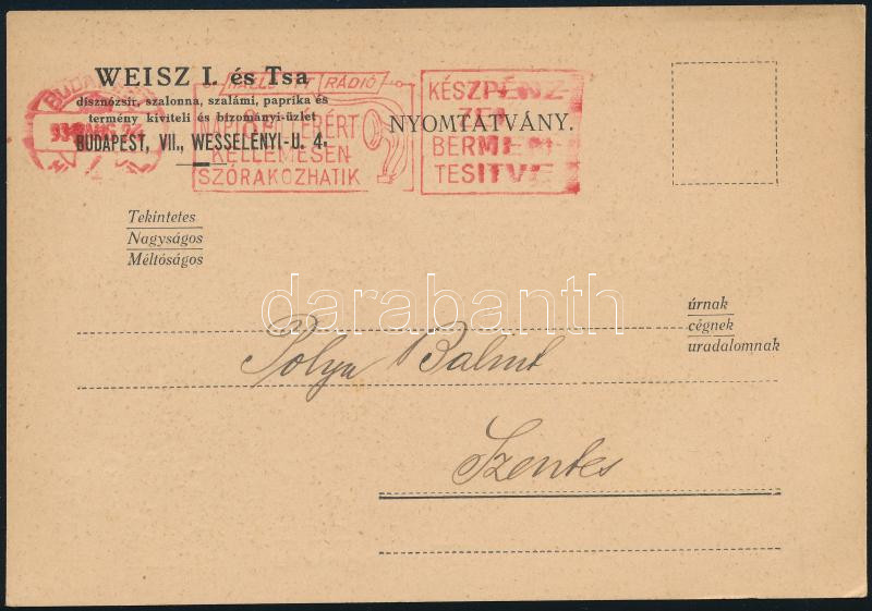1934 Bp., Weisz I és Tsa. disznózsír, szalonna, szalámi és terménykiviteli és bizomány üzlet levelezőlapja
