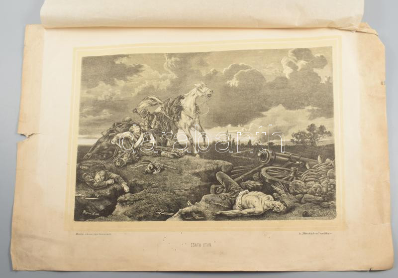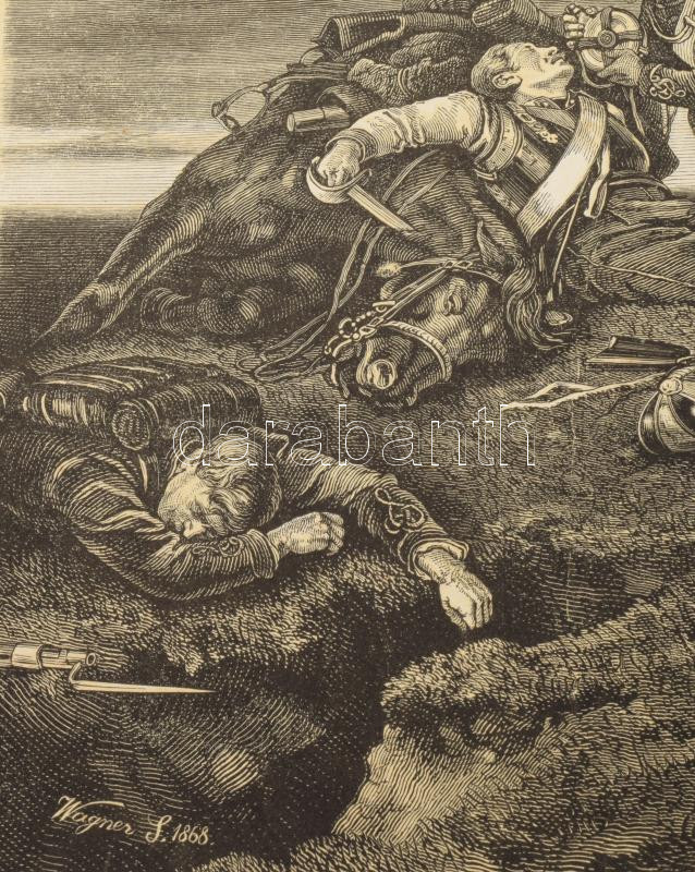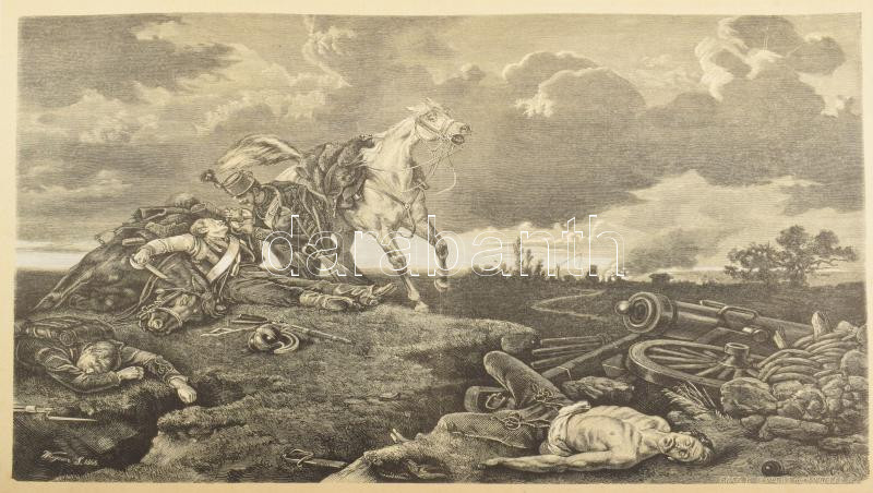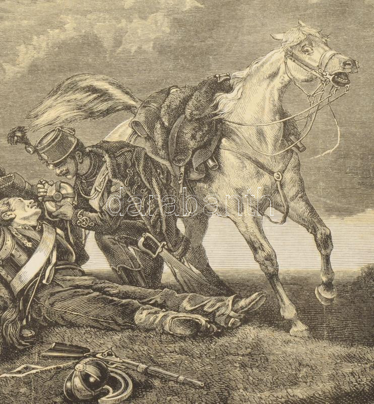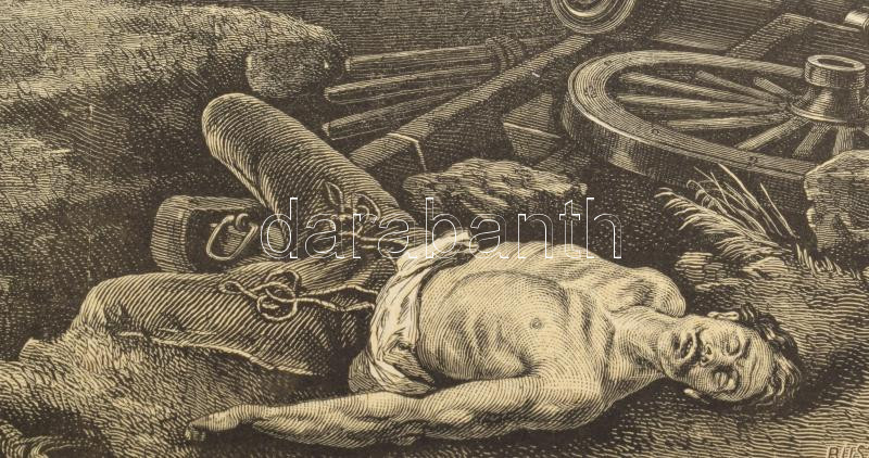 1868 Wágner Sándor (1838-1919) után Morelli Gusztáv (1848-1909) metszése: Csata után, a Honvédalbum melléklete, fametszet, papír, jelzett a metszeten, lapszéli sérülésekkel, kissé sérült hártyapapírral, 20,5x31 cm