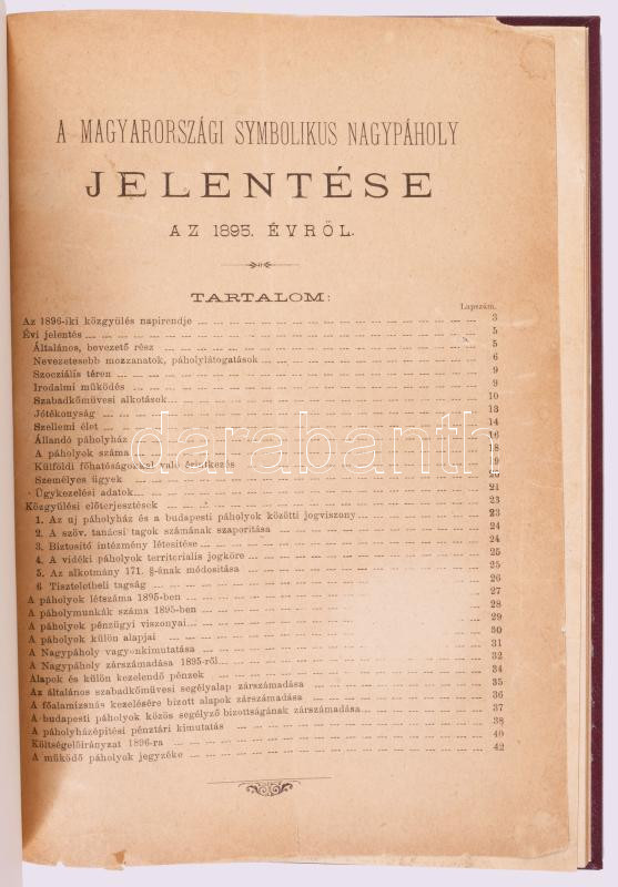 1896 A Magyarországi Symbolikus Nagypáholy jelentése az 1895. évről. + 1909 Munkatábla a Magyarországi Symbolikus Nagypáholy 1909. évi március hó 27. és 28-ik napjain tartott XXIV. rendes Nagygyűléséről. [Egybekötve.] 42 p.+ 20 p. Modern műbőr-kötésben, helyenként kissé sérült, foltos lapokkal.