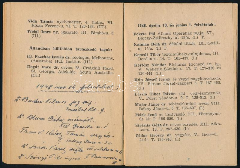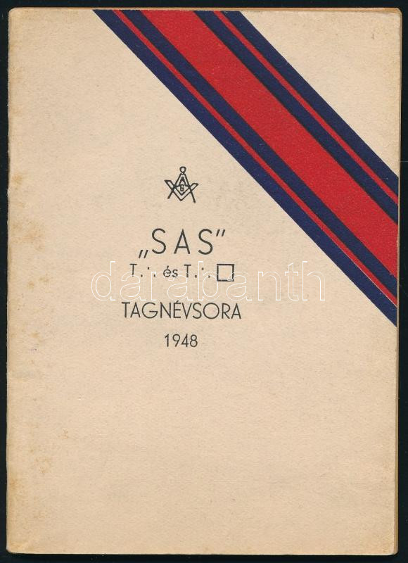 A Magyarországi Symbolikus Nagypáholy védelme alatt dolgozó ,,Sas" t[örvényes] és t[ökéletes] páholy tagnévsora 1948. Bp., Otthon-ny. A páholytagok névvel és cÃmmel ellátott listája, benne további, kézzel bejegyzett nevekkel (,,1948 nov. 16 felvételek"). Kiadói tűzött papÃrkötés.