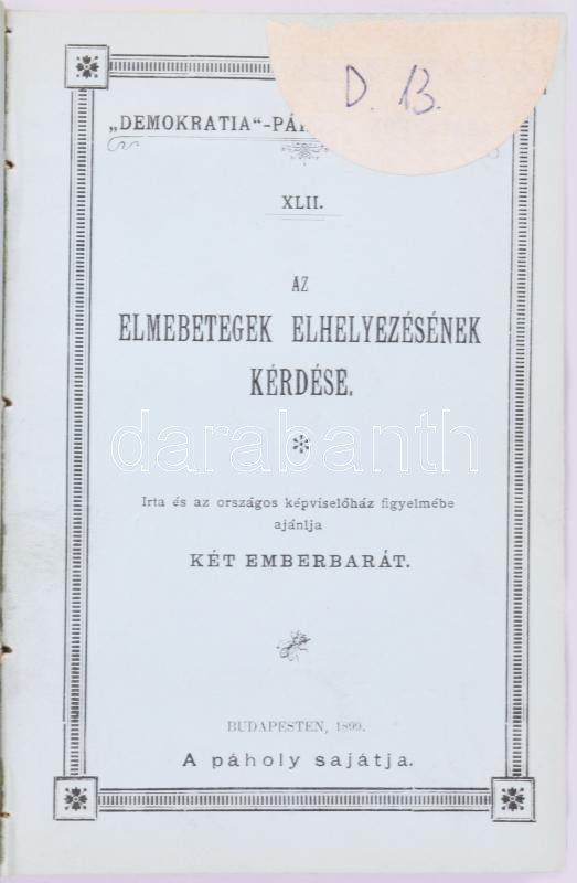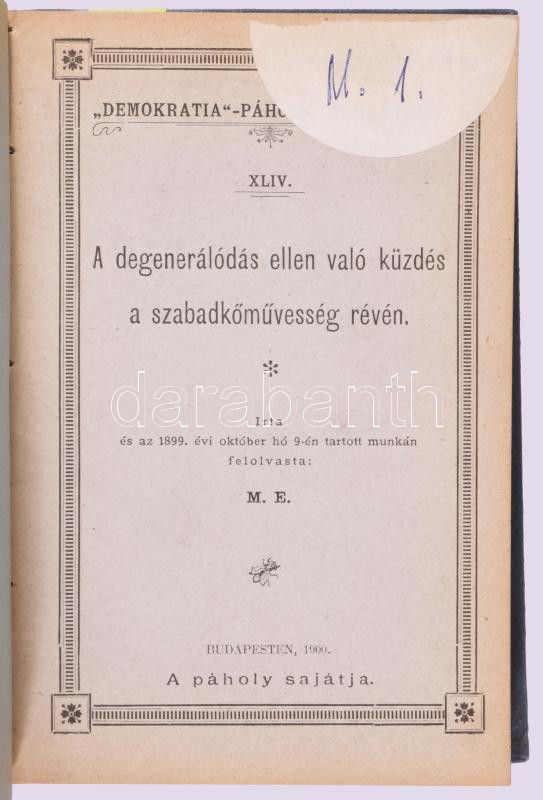 Kolligátum a ,,Demokratia"-páholy könyvtára füzeteiből (11 füzet egy kötetben): Horváth János: Az örök béke problémája.; Fölvételi beszéd.; Az elmebetegek elhelyezésének kérdése.; Tihanyi Mór: Szabadkőműves-eszmék az ókori görög bölcsészek tanaiban.; A degenerálódás ellen való küzdés a szabadkőművesség révén.; A ,,Demokratia" páholy jelentése az 1899. évről.; Hogyan szervezzük a fővárosi munkás-otthont?; Pikler Gyula: A jótékonyság központosítása.; A ,,Demokratia" fölavatásának 10-dik fordulóján.; Krasznay Ferenc: Látogatásom és angol szkvsi páholyban. - Márkus Miksa: Évfordulóra való szónoki beszéd.; A ,,Demokratia" alapításának 11. évforduló ünnepe. Bp., 1899-1900, ,,Demokratia" Páholy. Egészvászon-kötésben, nagyrészt jó állapotban, kissé koszos borítóval.