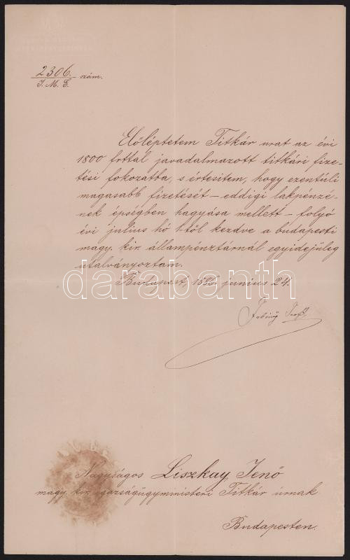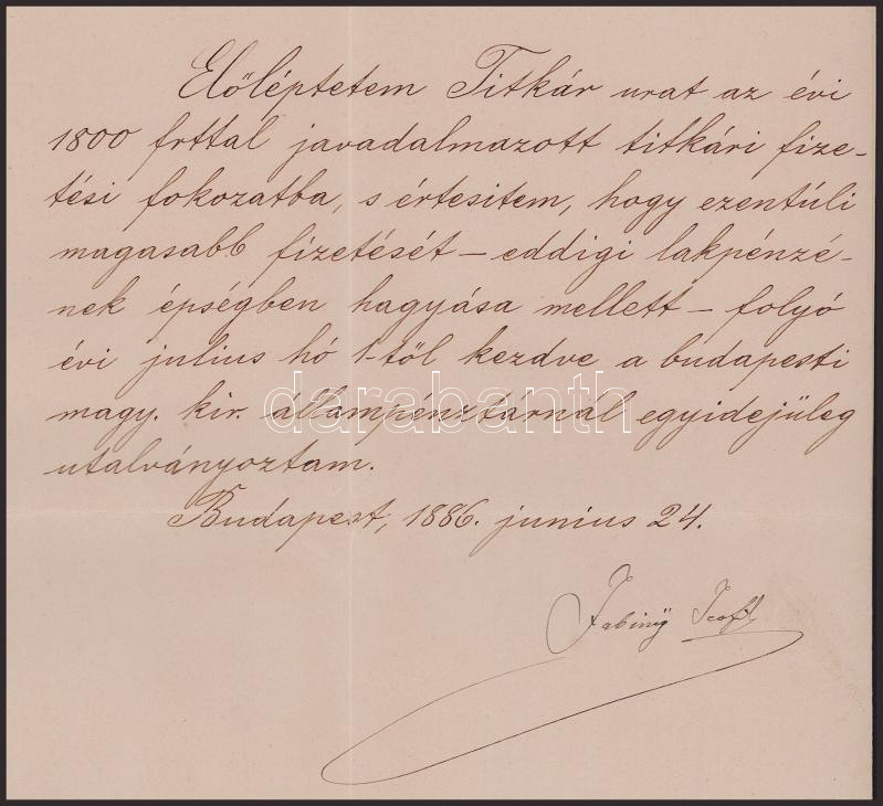 1886 Bp., Fabiny Teofil (1822-1908) igazságügy-miniszter autográf aláírása Liszkay Jenő igazságügy-miniszteri titkár részére szóló előléptetésen