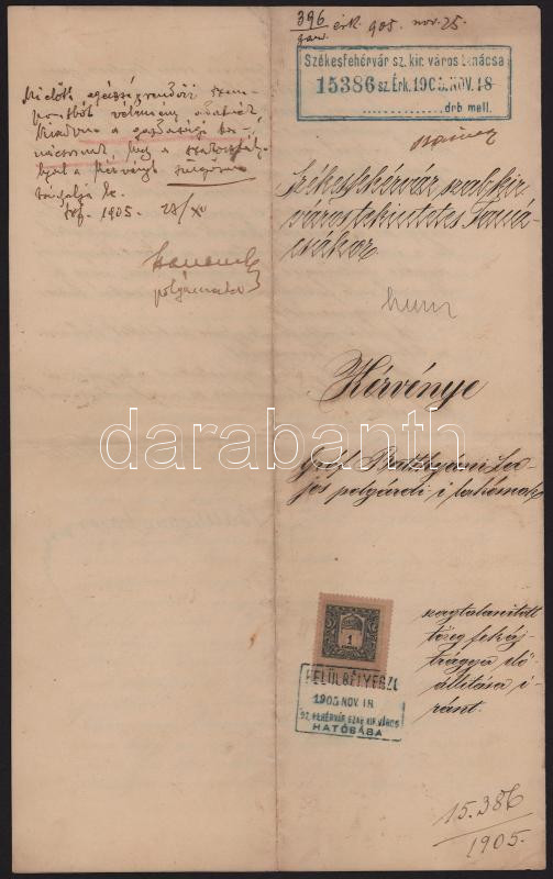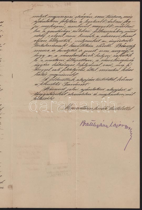 1905 németújvári gróf Batthyány Lajos (1860-1951), GyÅ‘r megye és város fÅ‘ispánja, fiumei kormányzó, GyÅ‘r országgyűlési képviselÅ‘je autográf aláÃrása Székesfehérvár sz. kir. város tanácsának küldött kérvényen, 1K okmánybélyeggel