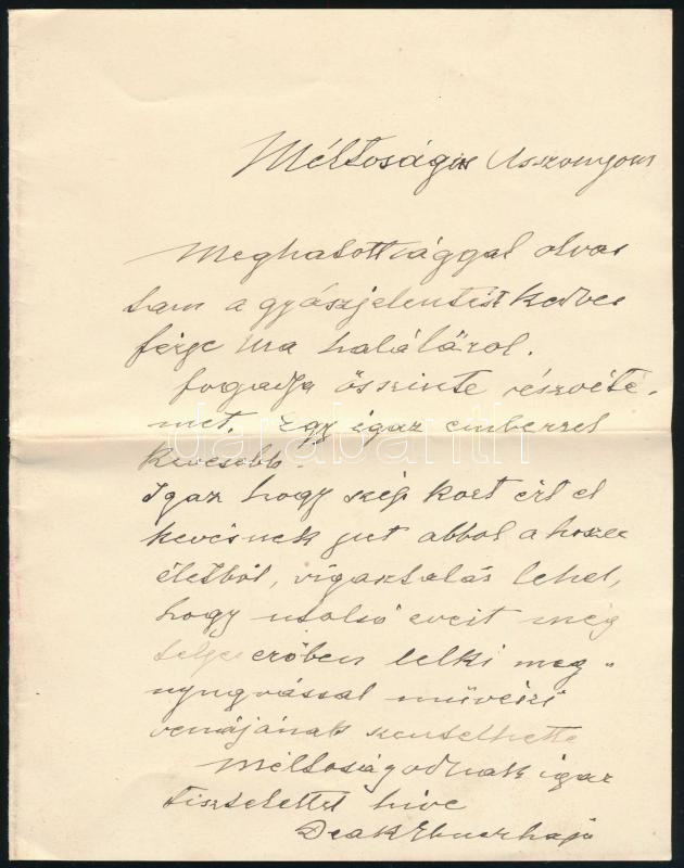 1929 Deák Ébner Lajos (1850-1934) festőművész saját kézzel írt és aláírt egy oldalas részvétlevele báró Korányi Annának férje, Soór Elemér hadtörténész elhunyta alkalmából, szép állapotban