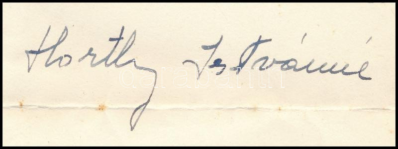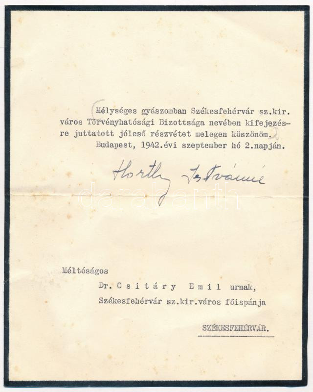 1942. szept. 2. Bp., Horthy Istvánné Edelsheim-Gyulai Ilona (1918-2013) autográf aláírása férje halála iránti részvétnyilvánítást megköszönő levelén, Csitáry Emil, Székesfehérvár főispánja részére címezve
