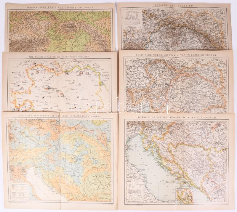 cca 1900 Az Osztrák-Magyar Monarchia térképei, 6 db térkép-melléklet a Brockhaus Konversations-Lexikonból, 25x31 cm