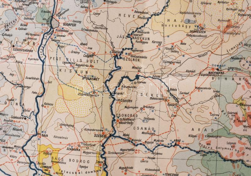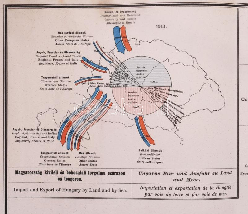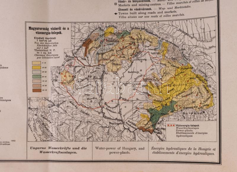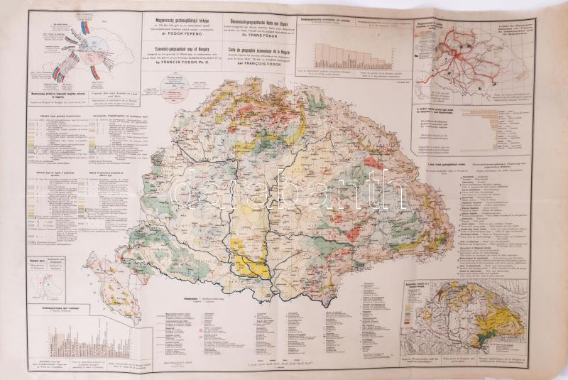 cca 1920 Magyarország gazdaságföldrajzi térképe. Teleki Pál gróf és Cholnoky Jenő közreműködésével szerk.: Fodor Ferenc. 1 : 1.500.000, Bp., Magyar Földrajzi Intézet Rt. Gazdasági adatokkal, statisztikákkal, közte a trianoni békeszerződés által okozott ipari és gazdasági veszteségekkel, négy nyelven (magyar, német, angol, francia). Kisebb lapszéli beszakadással, 63x95 cm