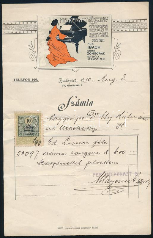 1910 Bp. IV. Gizella tér, Heckenast Gusztáv zongoraterme szecessziós dekoratív, okmánybélyeges kitöltött számlája, hajtva, jó állapotban