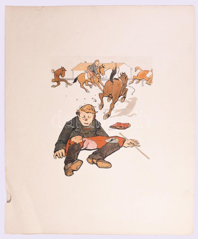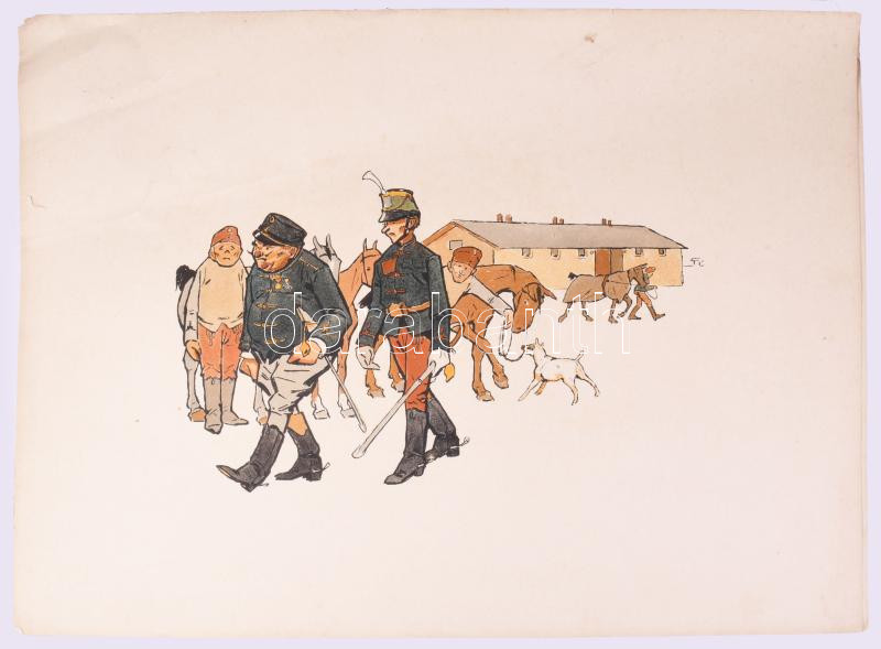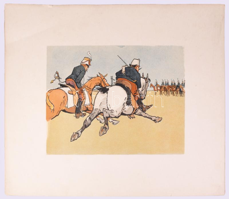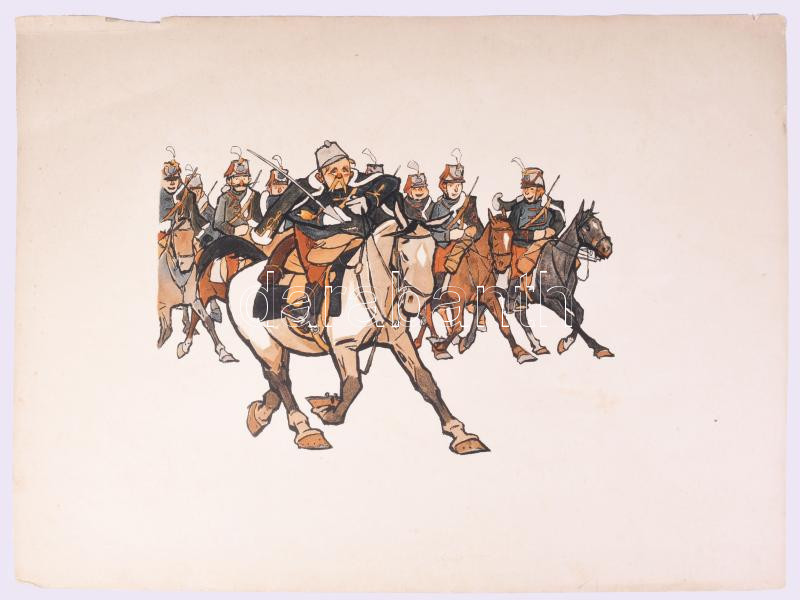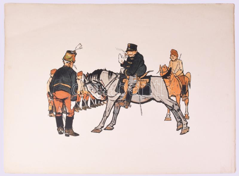 cca 1905-1915 Pajtás Ödön (Szmrecsányi Ödön) (1874-1954): Katonai témájú, huszárokat ábrázoló karikatúrák, 8 db nagyméretű, színes litográfia, Bp., Singer és Wolfner - Könyves Kálmán Magyar Műkiadó Rt., változó állapotban, kisebb lapszéli sérülésekkel, 39x50 cm