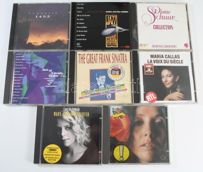 8 darab zenei CD, Vangelis, Jazz Central Station, The Great Frank Sinatra, Mary-Chapin Carpenter, Maria Callas, stb, egy részük tartóban.